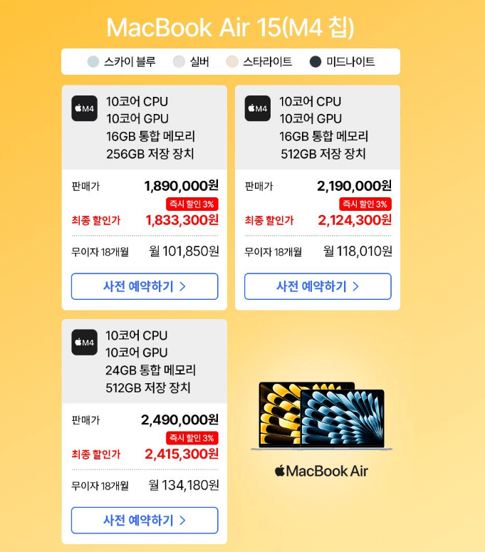 - 3% 즉시 할인: 모든 맥북에어 M4 모델에 적용되는 기본 할인